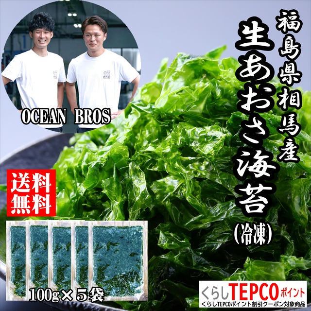 福島県相馬松川浦産 生あおさ海苔(冷凍)100g×5袋 *くらしTEPCOポイント割引対象商品 中澤水産OCEAN BROSがセレクトしたセットです。 ○福島県相馬松川浦産 生あおさ海苔(冷凍)100g×5袋 福島県相馬市松川浦は「あおさ海苔」の一大産地で、収穫される種類は「ヒトエグサ」です。風味豊かな磯の香りと食感、旨味が魅力です。通称「青のり」や「あおさ」と呼ばれ親しまれています。 毎年12月末に新漁の解禁となり3月後半まで収穫されます。景勝地松川浦の上に鮮やかな海苔棚の絨毯が敷かれる光景が見られます。 味噌汁、天ぷら、和え物、など様々な料理で美味しく食べることができます。 通常流通しているのは乾燥させて物ですが、本製品は採れたての「あおさ海苔」を生のまま冷凍いたしました。 名称:あおさ海苔(冷凍) 原材料:ヒトエグサ 産地:福島県産 賞味期限:製造日より365日