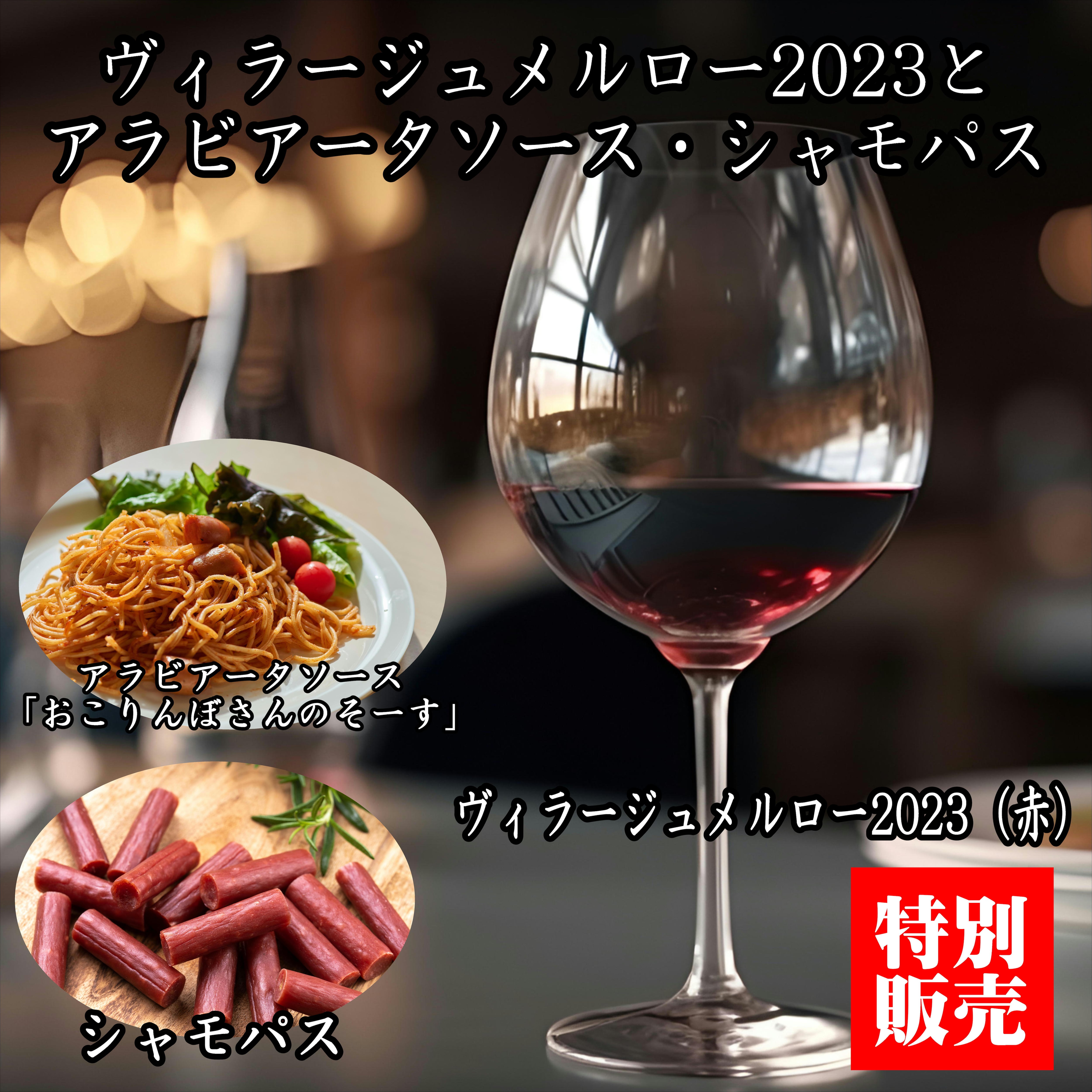 ヴィラージュメルロー2023赤と アラビアータソース・シャモパス