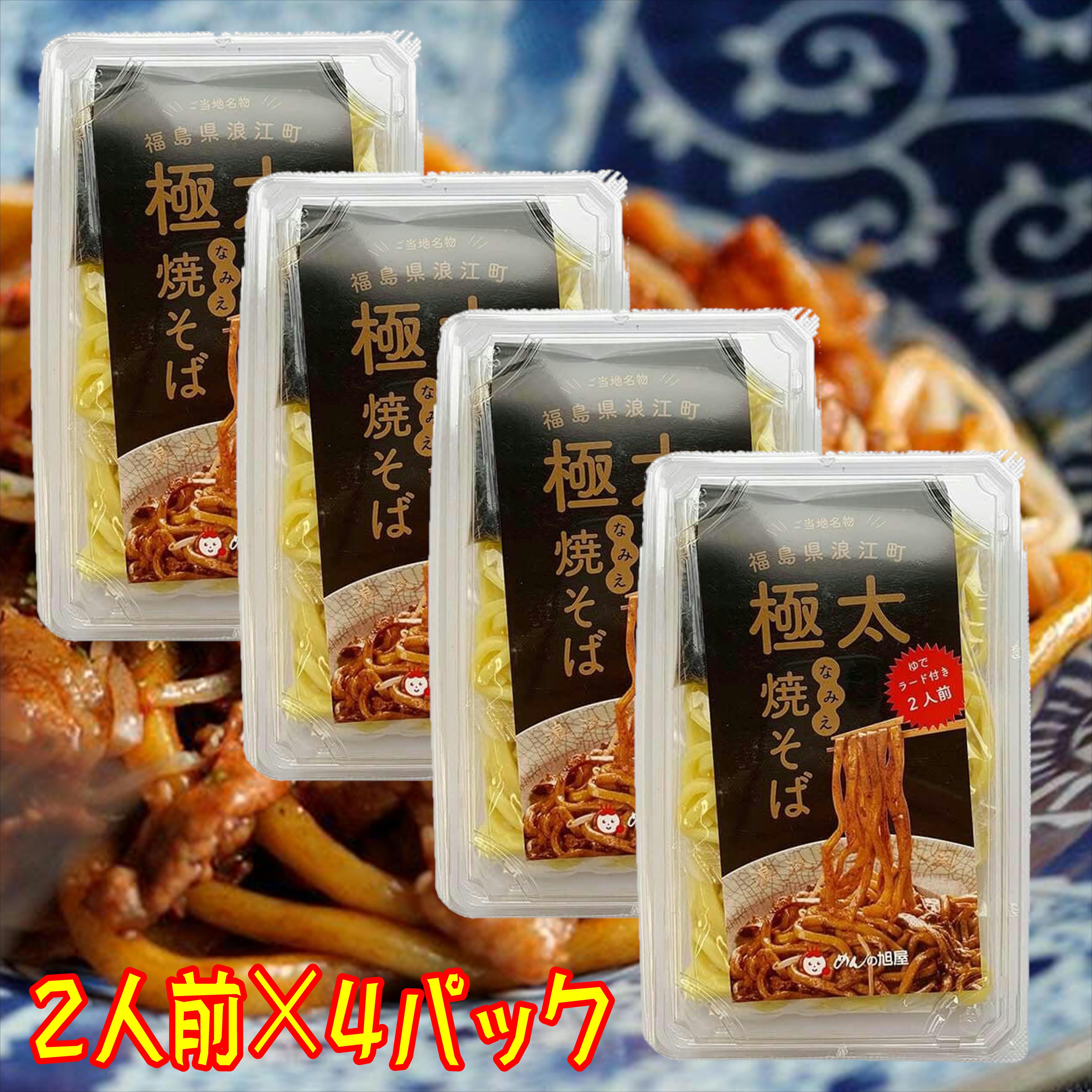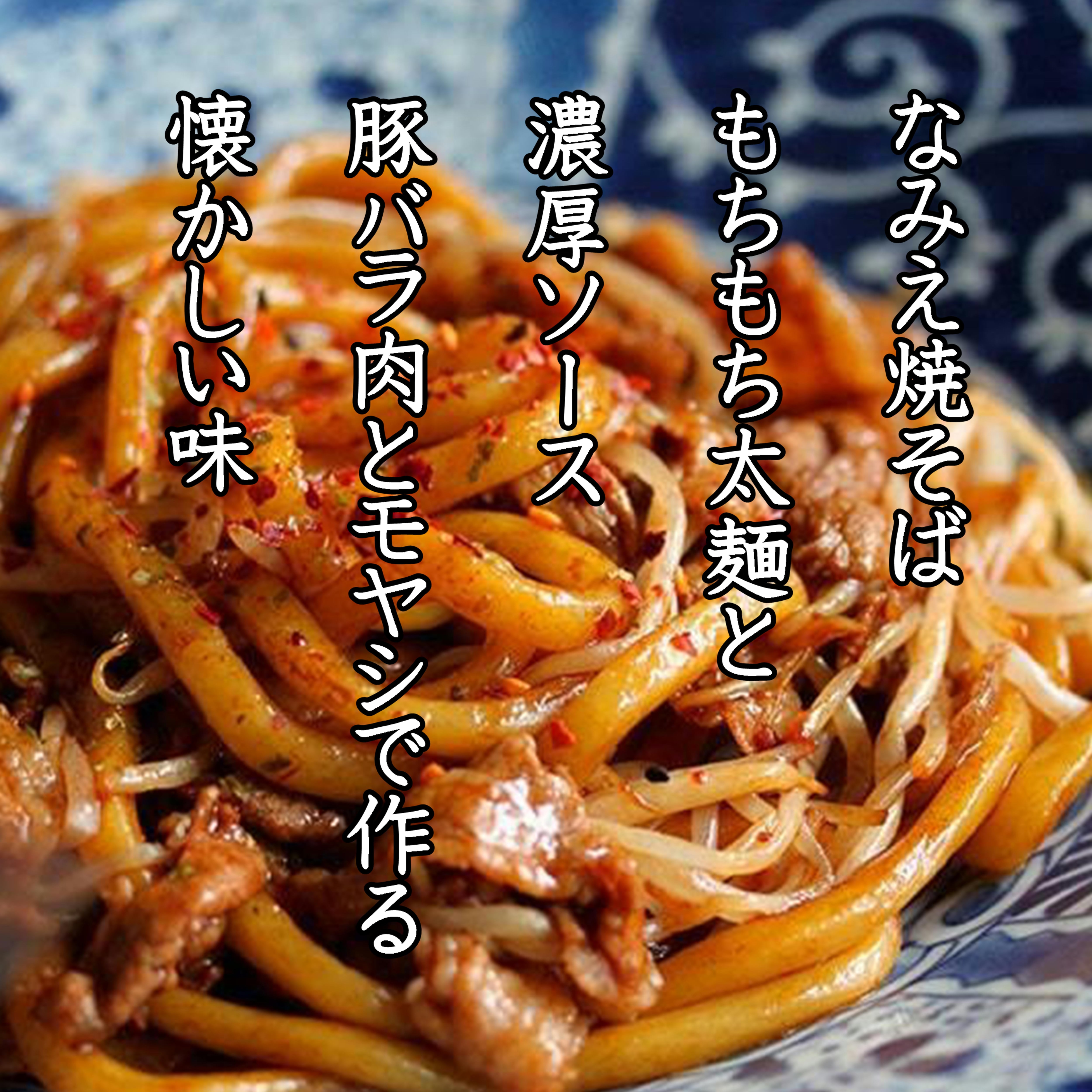 福島県双葉郡浪江町の安くておいしい、昔から親しまれる極太麺の『なみえ焼そば』。約50年前、労働者のために食べ応えと腹持ちをよくするために考案されたとされています。通常の約3倍のもある太い麺と、うまみたっぷり濃厚ソース、豚肉とモヤシだけのシンプルな具が特徴です。一味唐辛子を振りかけて食べるのが通な食べ方とされています。