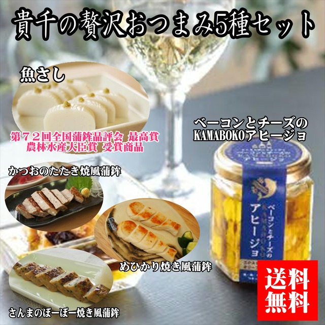 ◇貴千の贅沢おつまみ5種セット 貴千は昭和38年の創業以来、創業者小松中司の教えをかたくなに守り、ふるさといわきの海に育まれながら、貴千はかまぼこの可能性を追い求めてきました。 かまぼこづくりを通して私たちが改めて気づいたことは、かけがえのない「ふるさと」の存在でした。おいしく、安心安全に食べられるだけでなく、かまぼこの中に、地域の歴史や風土、文化をも摺り込んでいきたい。かまぼこをつくるということは、ふるさとのよさを引き出し、ふるさとを摺るということ。貴千が摺り上げたいわきの味を、ぜひご賞味ください。 (内容) KAMABOKOアヒージョ1本、魚さし1本、さんまのぽーぽー焼風蒲鉾1枚、めひかり焼き風蒲鉾1枚、かつおたたき風蒲鉾1枚 魚さしについては第72回全国蒲鉾品評会 最高賞 農林水産大臣賞 受賞商品を受賞しております。